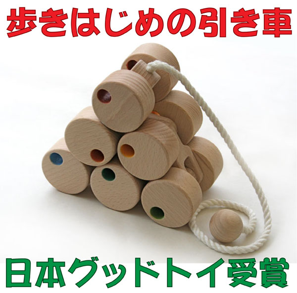 十二輪車(ロングタイプ)は、随分シンプルに出来ていると思いませんか?ブナの白い木肌がきれいな車輪。車輪に空いた穴にはきれいな色がほんのちょっと塗られています。それに車を引っ張り転がすための白くて長いロープ。たったこれだけのとてもシンプルなデザインにまとまっていますよね。でも、そのおもしろさは、オススメです。ラッピングについて●日本グッド・トイ受賞玩具(1)へ●日本グッド・トイ受賞玩具(2)へ●よちよち歩きにプルト-イへ●名入れのご注文ページへお店のTOPへ十二輪車(ロングタイプ)歩き始めにピッタリのプルトイロープを引くとカラカラと軽い音がして、6個の車輪がそれぞれユーモラスに回転します。進行方向に転がる車輪と逆に転がる車輪の動きは、子供でなくても思わず手を伸ばしたくなります。動きの楽しいおもちゃは、赤ちゃんが何とか手に入れようとするため、自然とはいはいやあんよの動作につながっていきます。 歩きはじめのお子さんもロープをひっぱると何処までもついて来るこのシンプルなおもちゃが大好きです。ロープのあやつり方によって大きく身体を使う遊びもできますので、小さなお子さんから腕白盛りのお子さんまで幅広く遊ぶことができます。----------東京おもちゃ美術館にて----------歩きはじめのお子さんから腕白盛りまで幅広く遊ぶことができます。ロープを引いてごろごろ転がしたりたり、くねくね車輪を上下に動かしたり、三角、平行四辺形、鯱形に組んだり、ひとつでたくさんのの遊びができるおもちゃです。ギァラリーで遊ぶ子供たち------7ヶ月の赤ちゃん------------東京おもちゃ美術館にて------------遊んでいるのは10ヶ月の赤ちゃん------ 六輪車は、六つの車輪が一つの三角形の車体につながっています。 六輪車(オープンタイプ)は、六輪車と同じ六つの車輪が二つの車体につながっていて、写真のように直線上にすることが出来ます。もちろん、六輪車と同じような形にも変形出来ます。 六輪車(歯車タイプ)は、六輪車の車輪が、歯車上になっているものです。機械仕掛けのような面白さがあります。 六輪車(ミニ)は、六輪車(オープンタイプ)が小さく手ごろな大きさになったものです。小さくてちょっと可愛らしい六輪車です。 十二輪車(ロングタイプ)は、六輪車(ミニ)の2倍の長さです。3段の三角形になったり、2段の平行四辺形になったり、自在に形を変えられる面白さがあります。● お買い物 Q&A ● ご利用案内 ● ラッピング ● お支払い・送料 ● サイトマップ●お名前入れサービスは有料ですのでこちらからお申し込み下さい。